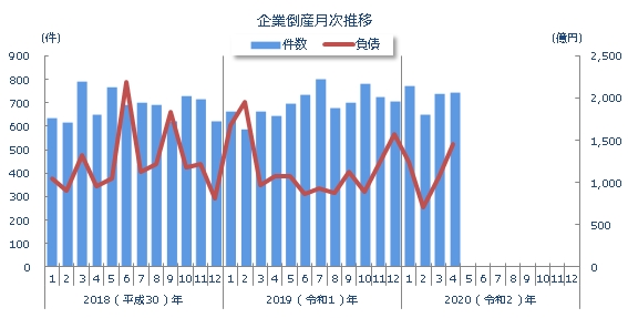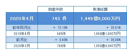 2020年4月度の全国企業倒産(負債額1,000万円以上)は、件数が743件(前年同月比15.1%増)、負債総額が1,449億9,000万円(同35.6%増)だった。