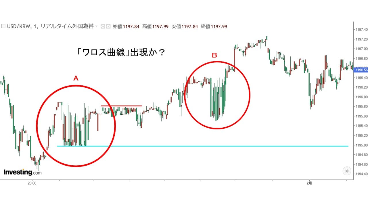 20:35(日本時間)~が「A」のポイント。22:39~(同左)が「B」のポイントです。「A」ではきれいに切りそろえたようにおよそ「1ドル=1,195.00ウォン」が底になってます。どこかで見たことのあるような値動きですね※。「そんな中途半端なところでは止まらないぜ」と申し上げたいところです。