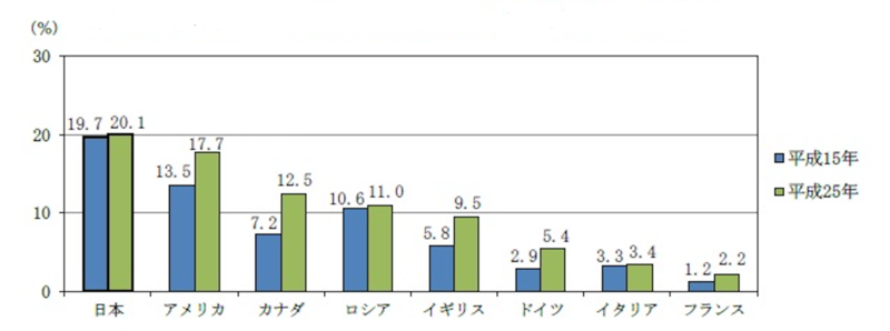 高齢者の就業率国際比較(平成15年、平成25年)出典:総務省統計局