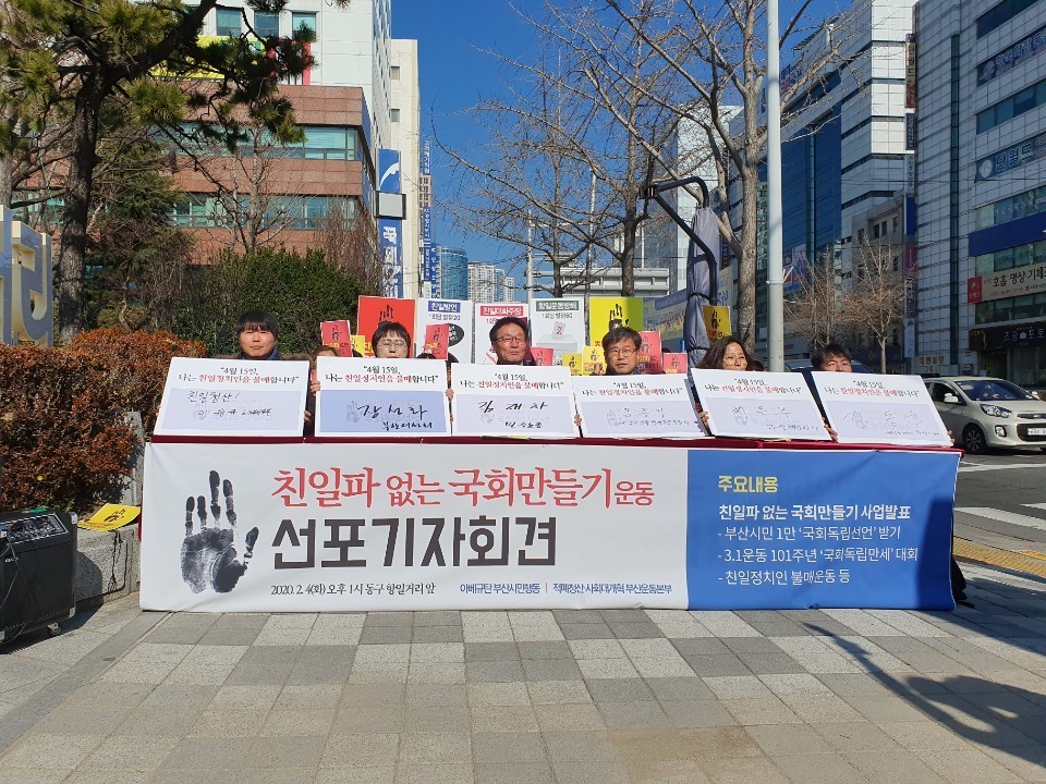 『安倍糾弾釜山市民行動』など160余りの市民社会団体は4日、東区(トング)草梁洞(チョリャンドン)の日本総領事館の近くにある鄭撥(チョン・バル)将軍銅像前の抗日通りの看板の前で記者会見を開き、「第21代国会議員選挙を控え、親日派のいない国会作り運動を展開する」と明らかにした。 これらの団体は、「平和繁栄、自主、積弊清算と平等の新しい時代を早めるために(この運動が)必要だ。キャンドル抗争で政権が変わったが、70年以上とぐろを巻いた既得権積弊勢力がそのままいるからだ」と説明した。