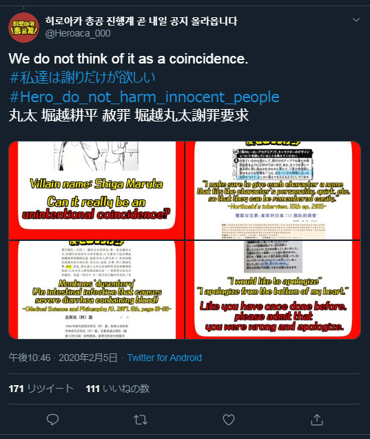 防疫部隊があの当時に用意されていた日本を理解できないレベル。Twitterで #Supporthorikoshi もしくは、#Support_Horikoshi など、大文字小文字の違いはあれど、世界中から作者への応援、支持が挙がっている。