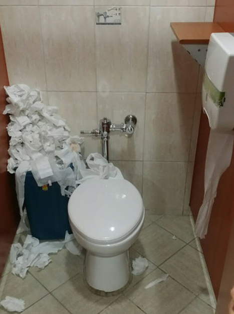 歯磨き粉とトイレットペーパーって。トイレットペーパーが散らばっていて