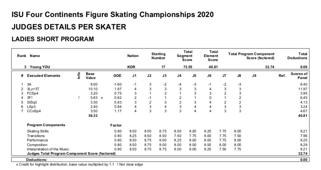 ジャッジが出した評価の最低と最大をカットし、残りの平均値にジャンプの係数(トリプルアクセルの場合は0.8)を掛けるので、今回の場合は0.27点しか変わらず、今のところ順位も変わらない。