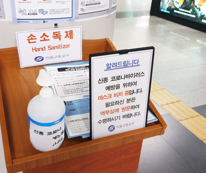 新型コロナウイルス感染症(武漢肺炎)が拡大の勢いを強めていた先月29日、ソウルの地下鉄駅291カ所の改札口に、マスクを収めた無人の籠が登場した。手の洗浄剤もセットで備えてあった。まだマスクの用意ができていない乗客のため、ソウル交通公社で用意したものだ。交通公社は、このためにソウル市からマスク150万枚の支給を受けた。