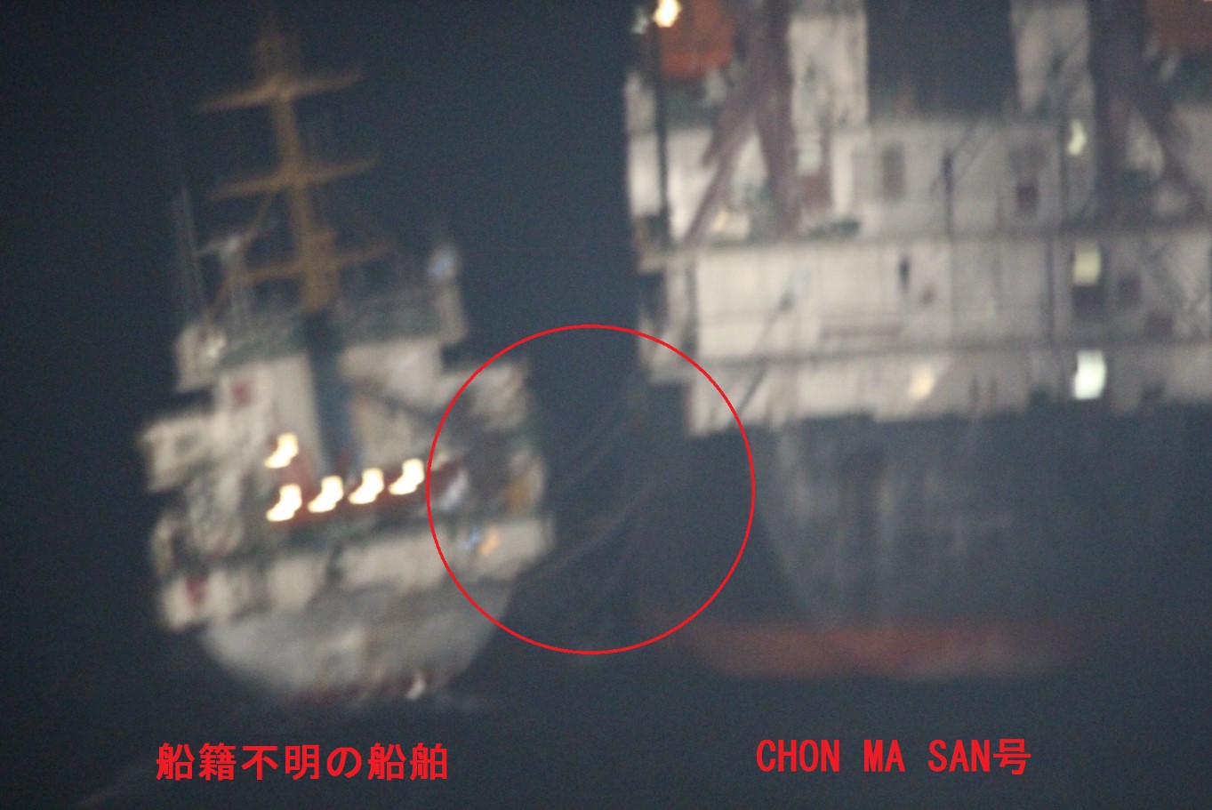 令和2年1月12日(日)未明、北朝鮮船籍タンカー「CHON MA SAN(チョンマサン)号」(IMO番号:8660313)と「明波 5」との表示がある船籍不明の船舶が東シナ海の公海上(上海の東約240㎞の沖合)で接舷(横付け)していることを海上自衛隊第1海上補給隊所属の補給艦「ときわ」(横須賀)が確認しました。