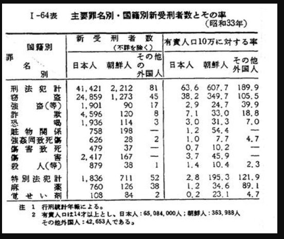 在留人員の多いところからか,外国人犯罪の大部分は,朝鮮人によるものである。朝鮮人の犯罪率の戦前からの推移を人口に対する新受刑者数の率で日本人とくらべてみると,昭和二年の刑法犯では日本人の一〇倍であったが,その後しだいに減少して,昭和一一年には四倍にまで下がり,その結果,昭和二-一一年の平均では七倍であった。戦時中は,さらに減少して,日本人の二倍となったこともあったが,戦後には,また,一〇倍前後にまで増加し,一四倍になった年(昭和二五年)もあった。昭和三三年にも,刑法犯について一〇倍の率になっているのであって,朝鮮人と他の外国人別に有責人口に対する率を算出すると,I-64表のとおりである。罪名別では,朝鮮人の犯罪率は,日本人のに対し,傷害致死一五倍,その他の傷害一二倍,恐喝一〇倍など,暴力犯罪に率が高い。そして,賍物関係では,四五倍という高率にのぼっている。特別法犯が七〇倍という高率を示すもっとも大きな原因は,出入国管理令違反が多いためであろうが,麻薬中覚せい剤事犯も三〇倍または二〇倍という高率である。もっとも,この統計表での犯罪率は,登録人口中の有責人口で計算した数を基礎とし,そのほかに未登録者を度外視しているので,実際よりも高い率がでていることを留意する必要があろう。