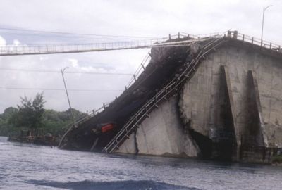 パラオのコロール島とバベルダオブ島を結ぶコンクリート橋、朝鮮のSOCIOが鹿島建設の半額で落札し1977年に完成したが、10年後には橋の正中線が1.2メートル下がるほどたわみ始めた。国際機関の調査によりクリープとコンクリートの弾性係数が予想よりも低かったことに起因とされ1990年にパラオ政府は230万米ドルをかけた補強工事行ったが1996年9月26日17時35分頃、轟音と共に突如中央部から真っ二つに折れて崩落して2名が死亡、4名以上が負傷した。