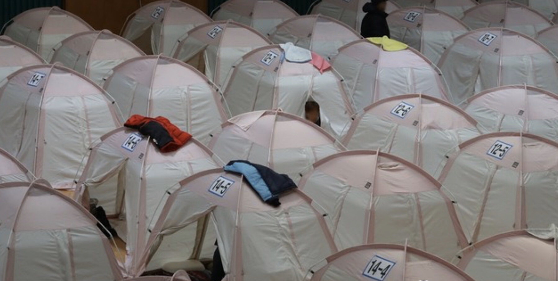 イ・ナギョン首相が28日午前、訪れた浦項興海室内体育館の入り口には、浦項地震被災者の体育館テント生活がどのくらいされたか、タイムリーな記事が書かれていた。 被災者が書いた赤い数字のように地震が発生してもう2年以上の時間がフルロトウナ体育館には、まだテントがぎっしりと設置されていた。