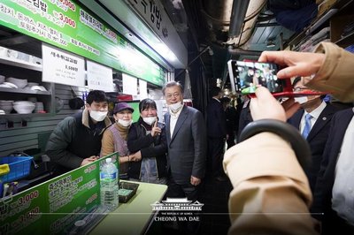 文在寅(ムン・ジェイン)大統領は12日、新型コロナウイルス感染の影響で訪問客が激減しているソウルの南大門市場を訪れ、店主らを激励した。記事は「先日の現場訪問の時と異なり、文大統領は店主らと握手を交わしていた」とし、「防疫に対する自信を示したものだとの見方もある」と伝えている。