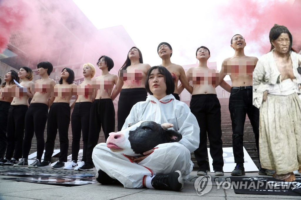 「搾乳に反対」ソウルで乳牛の苦痛パフォーマンスを実施中