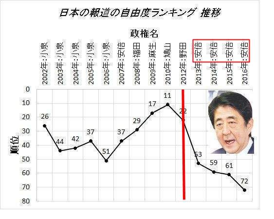 鳩山政権(民主党)時が、報道の自由度が高い❓