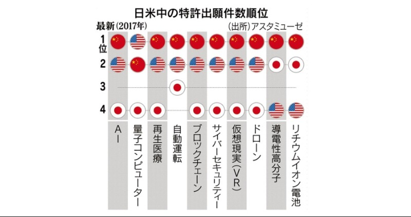 17年には韓国がAIや再生医療、仮想現実(VR)など6つの分野で逆転したという。
