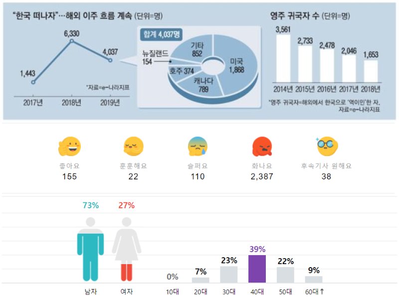 しかし、毎日経済が錯視効果をなくすために、全体の海外移住者数から現地移住者数を除いて集計した移民の数も2017年825人、2018年879人、2019年980人と3年連続増加の一途にあるという事実が確認された。これは純粋に国内から海外に移民に行った移住者の数だ。