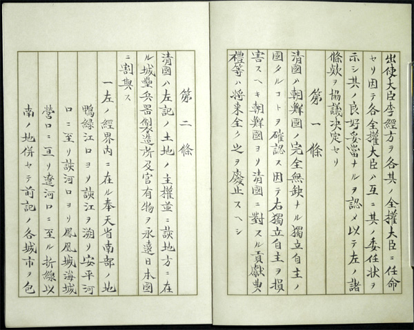 第1条 この盟約は清兵を朝鮮国より撤退させて、朝鮮国の独立自主を強固にし、日朝両国の利益を増進