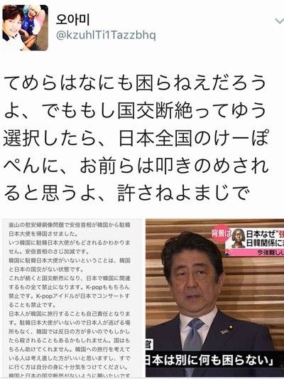 「あなたは、何も困らないだろう。でももし、国交断絶と言う、選択をしたら、日本全国のK-POPファンに、お前らは、叩きのめされると思うよ。許さないよ、本当に。」