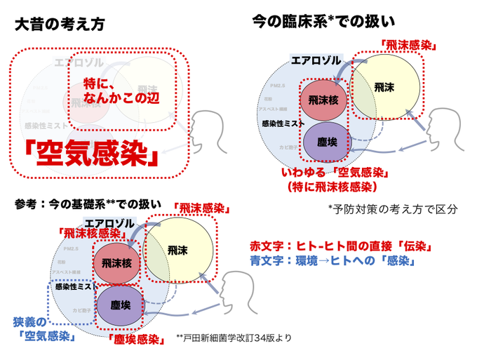 エアロゾル感染は、感染力が非常に大きい空気感染とは異なるとされるが、患者のせきやくしゃみによる飛沫感染と比べると感染範囲は拡大する。