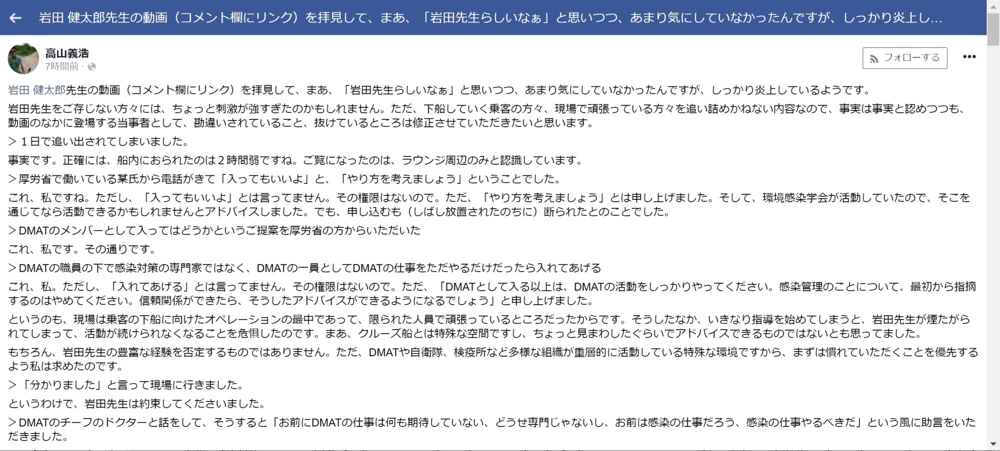 これ事実です。岩田先生は、これで自分は感染対策についての活動ができるようになったと理解されました。ただ、船には、DMATのみならず、厚労省も、自衛隊も、何より船長をはじめとした船会社など、多くの意思決定プロセスがあります。その複雑さを理解されず、私との約束を反故にされました。せめて、私に電話で相談いただければ良かったんですが、そのまま感染対策のアドバイスを各方面に初めてしまわれたようです。