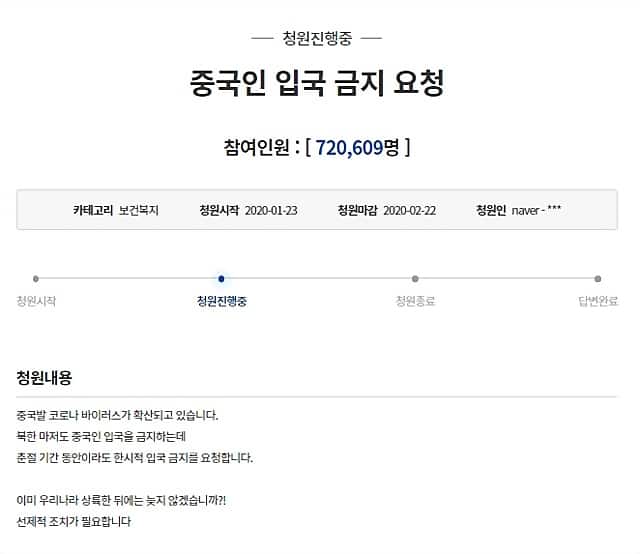 先月23日、青瓦台国民請願サイトには「中国人入国禁止要請」というタイトルの請願文が上がってきました。