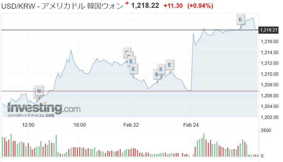 コロナ19の確定者が国内で急増するうえ、対中国輸出の減少に企業が稼いだドルが減った場合、ウォン/ドルのレートは上昇の圧力を受けるためだ。