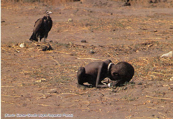 これは結構有名な写真で、この子は母親と一緒に食料を貰いに来てて、母親は、この子のすぐ近くにいたんだよ。写ってないだけで。