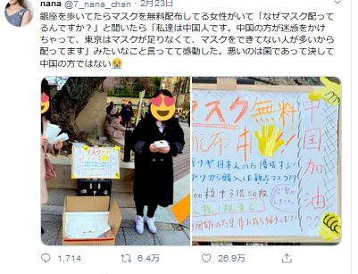 銀座を歩いてたらマスクを無料配布してる女性がいて「なぜマスク配ってるんですか?」と聞いたら「私達は中国人です。中国の方が迷惑をかけちゃって、東京はマスクが足りなくて、マスクをできてない人が多いから配ってます」みたいなこと言ってて感動した。悪いのは菌であって決して中国の方ではない