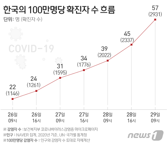 韓国100万人当たり確定者57人..コロナ19の震源地は中国よりも多く