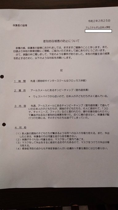 コロナウイルスのせいで日本人の子供がオランダ人から暴行を受けたための注意喚起が学校からでた。