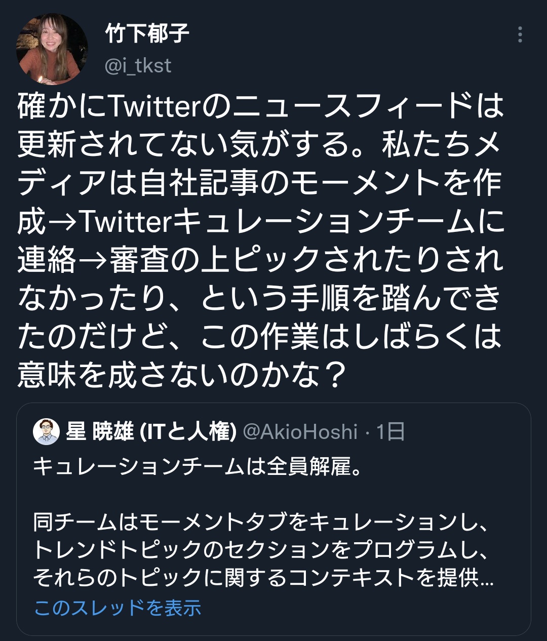 日本では特に、広報部門が中心になって実施していたとみられるキュレーションチームほぼ全員の解雇が伝えられると同時に、Twitter公式のニュースフィードやモーメントが完全停止するという事件が発生しました