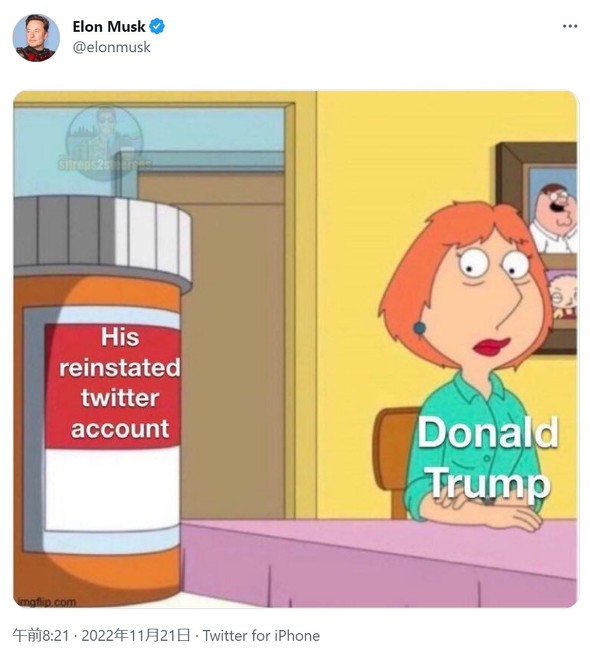 マスク氏は20日の午後3時過ぎに、トランプ氏がツイートする誘惑と戦っていることを示す画像(コメディアニメ「ファイリー・ガイ」の1シーンを利用したパロディ)を投稿した。企業としての「Twitter」が消滅、「X」と呼ばれる企業に統合される
