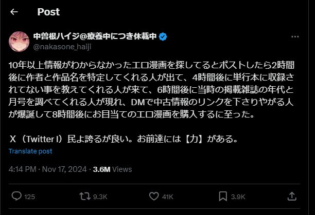米Xは24日に、Twitterのブランド名を「X」に変更するとツイート。サービスのアイコンを新調した他、「x.com」というドメインにアクセスするとTwitterにリダイレクトされるようにしている。10年以上情報がわからなかったエロ漫画を探してるとポストしたら2時間後に作者と作品名を特定してくれる人が出て、4時間後に単行本に収録されてない事を教えてくれる人が来て、6時間後に当時の掲載雑誌の年代と月号を調べてくれる人が現れ、DMで中古情報のリンクを下さりやがる人が爆誕して8時間後にお目当てのエロ漫画を購入するに至った。