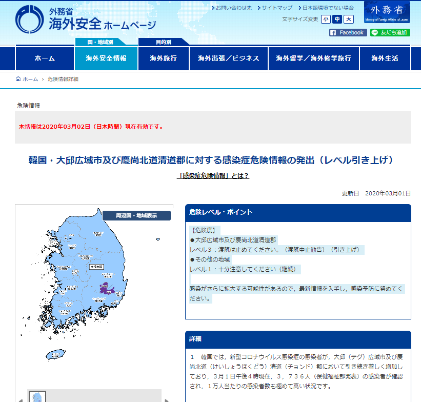 また,韓国の大邱広域市及び慶尚北道清道郡に対する感染症危険情報レベル2(不要不急の渡航は止めてください)は引き続き維持されています。