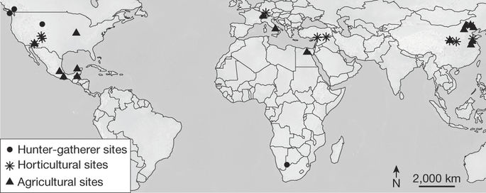 食料栽培や家畜。建物面積。社会の数千軒の家屋を分析した。狩猟採集の集落、古代都市など、過去1万1000年間。北米よりもユーラシアではるかに顕著に拡大。家畜(馬、牛、豚など)がユーラシアに存在し、北米にほとんど存在していなかった。家畜は、畑を耕し、物資を輸送、兵器乗り物として使える、兵士の養成につながり、その結果、ユーラシアの社会が領地を拡大し、より多くの富を獲得できた。とする分析。