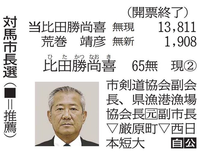 長崎県対馬市長選は1日投開票され、無所属現職の比田勝尚喜氏(65)=自民、公明推薦=が、無所属新人で飲食店経営の荒巻靖彦氏(55)を破り、再選を果たした。昨年の日韓関係悪化で韓国人観光客が激減し、活力あるまちづくりをどう進めるかなどが争点となった。