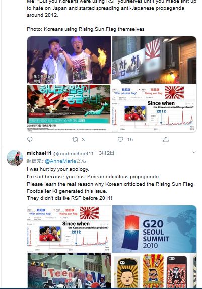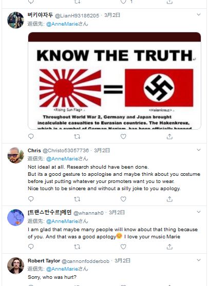 しかし、司会者たちが旭日旗の描かれた白いはちまきをしていたことで、物議をかもした。韓国のインターネットユーザーを中心に、二人を非難する書き込みが殺到。アン・マリーがこれを身に着けていたわけではないが、道義的責任を取ったというわけだ。