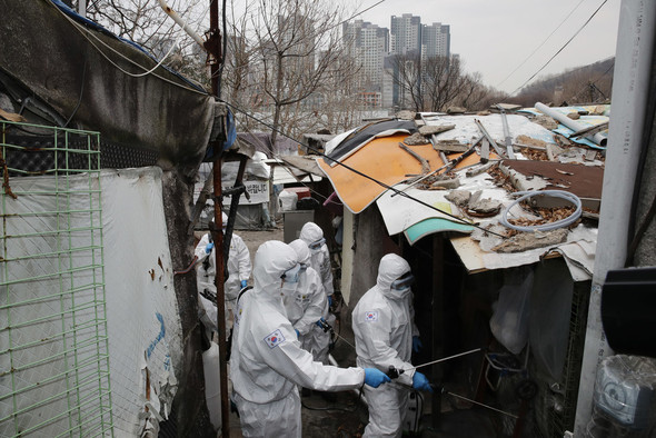 写真は、首都防衛司令部の将兵たちが今月3日午後、ソウル江南区開浦洞の九龍村で防疫作業を行っている。ソウル市は首防司の協力を得て管内の緊急防疫に兵力と装備を投入したが、毎日自治区別に申請を受け付け、大衆が集まる場所を中心に消毒する計画だと発表した=イ・ジョンア記者//ハンギョレ新聞社