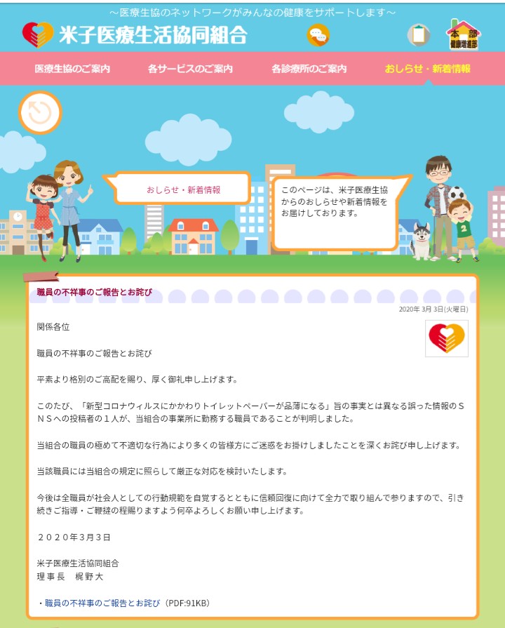 米子医療生活協同組合は3日、同組合の職員が「トイレットペーパーが品薄になる」というデマの投稿者の1人だったとして公式サイトで謝罪した。