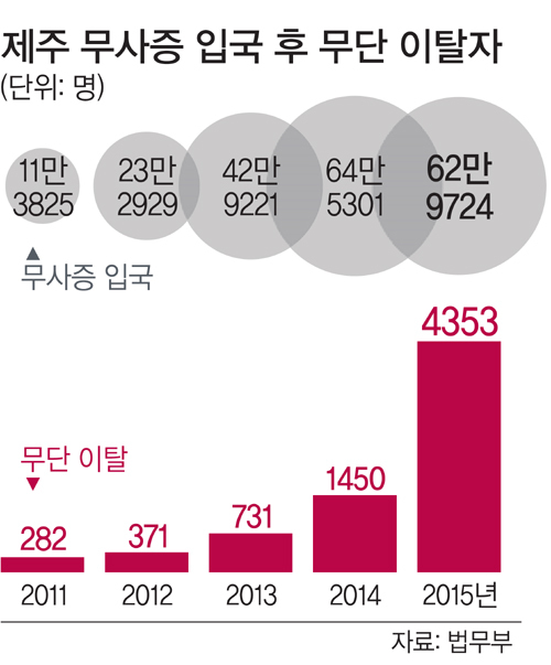 なお、韓国政府は済州島での違法滞在(つまりは入国後に行方不明)の数字は2015年以降は公表を止めた(下が行方不明)