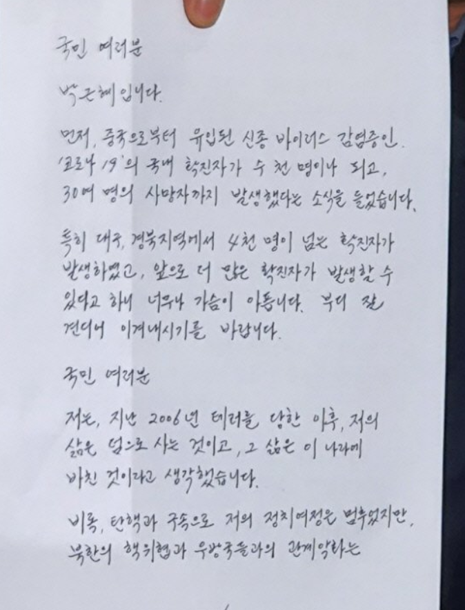30여 명의 사망자까지 발생했다는 소식을 들었습니다. 특히 대구 ,경북지역에서 4천 명이 넘는 확진자가 발생하였고, 앞으로 더 많은 화진자가 발생할 수 있다고 하니 너무나 가슴이 아픕니다. 부디 잘 견디어 이겨내시기를 바랍니다. 국민 여러분 저는 지난 2006년 테러를 당한 이후, 저의 삶은 덤으로 사는 것이고,그 삶은 이 나라에 바친 것이라고 생각했습니다. 비록, 탄핵과 구속으로 저의 정치여정은 멈추었지만 북한의 핵위협과 우방국들과의 관계 악화는