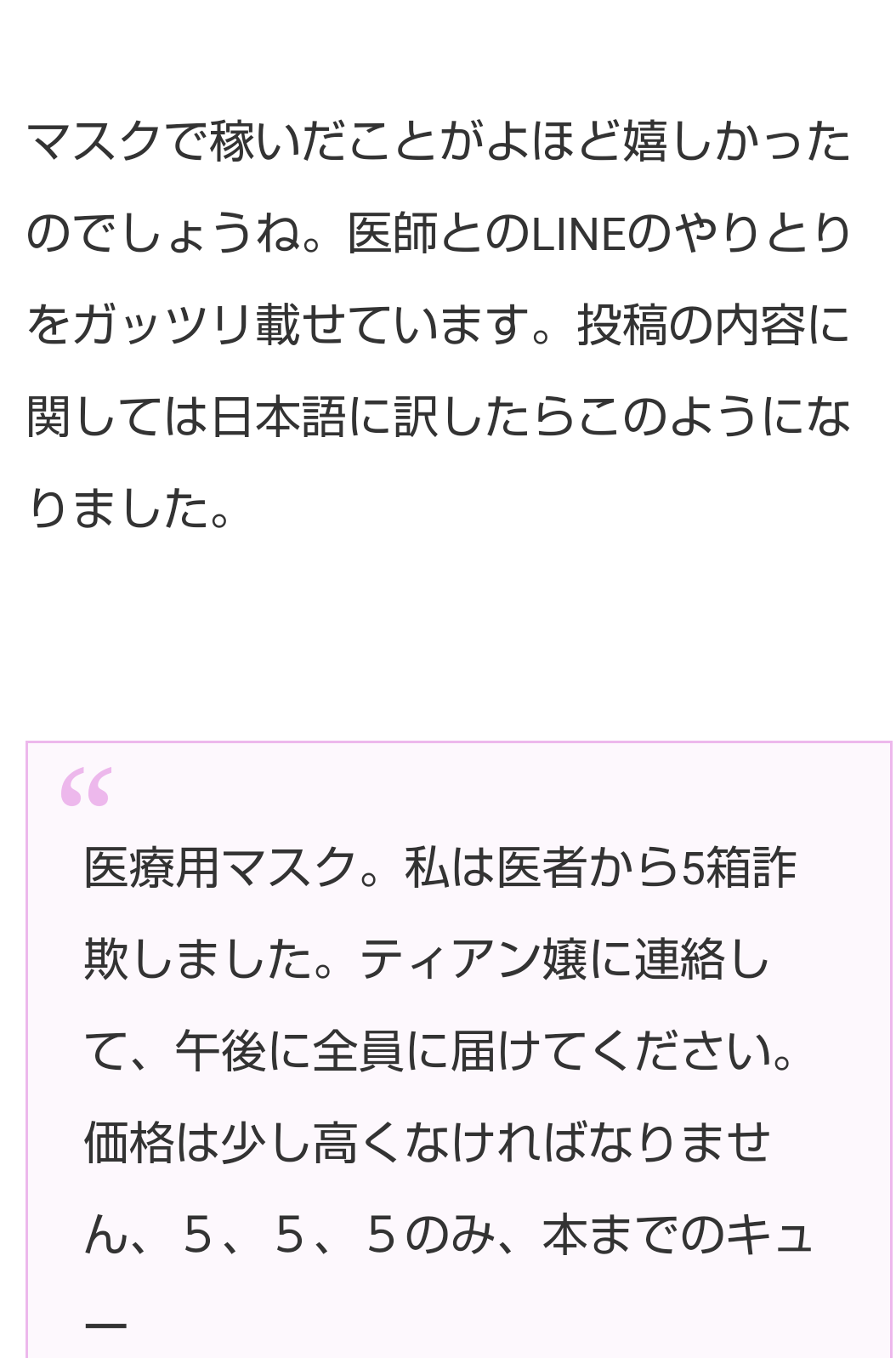 数週間前、テレビに出ていた消毒液生産会社の人が「中国から年間生産量以上の注文が入っている」とインタビューに答えていました。