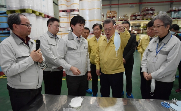 ムン・ジェイン大統領が6日午後マスクメーカーである京畿道平沢市㈜祐一シエンテックを訪問し、マスク原材料倉庫を見回している。