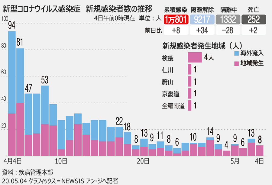韓国疾病管理本部中央防疫対策本部が4日、新型コロナウイルス感染者が3日0時から24時までの間に新たに8人(4日0時現在)確認されたと発表した。これにより、韓国国内の感染者数は1万801人に増えた。完治した患者は前日より34人増えて9217人になった。死亡者は前日より2人増えて252人。