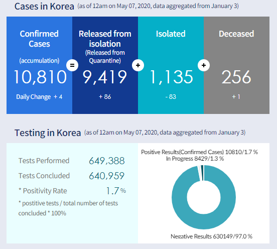 韓国疾病管理本部中央防疫対策本部が7日、新型コロナウイルス感染者が6日0時から24時までの間に新たに4人(7日0時現在)確認され、韓国国内の累計感染者数は1万810人と発表した。完治した累計患者数は前日より86人増えて9419人で、累計死者数は前日より1人増えて256人。
