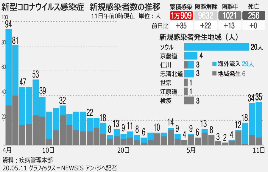 韓国疾病管理本部中央防疫対策本部が11日、新型コロナウイルス感染者が10日0時から24時までの間に新たに35人(11日0時現在)確認され、韓国国内の累計感染者数は1万909人と発表した。完治した累計患者数は前日より22人増えて9632人、累計死者数は前日と変わらず256人。