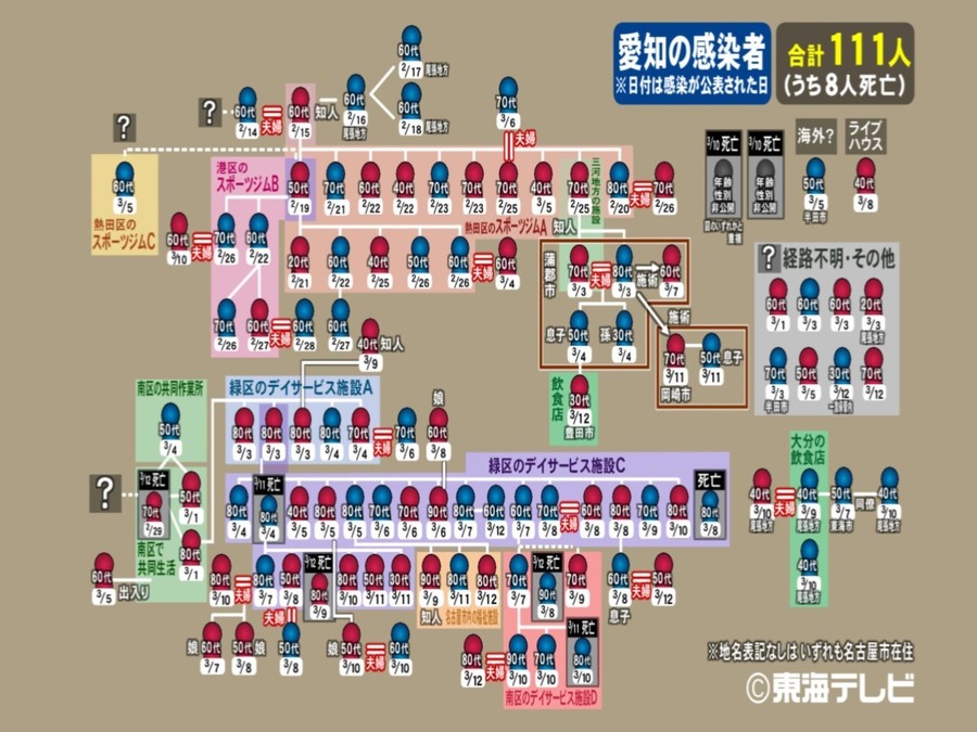 また、蒲郡市に住む60代の女性は、3月3日に陽性判定された80代の男性から感染したとみられています。