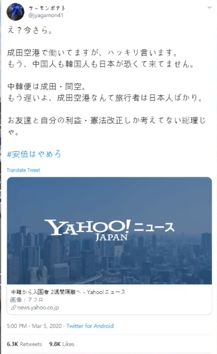 同じ反日の中国すら理解しているのに。韓国って自分達が防疫に失敗して感染者を増やした自覚が無いよな