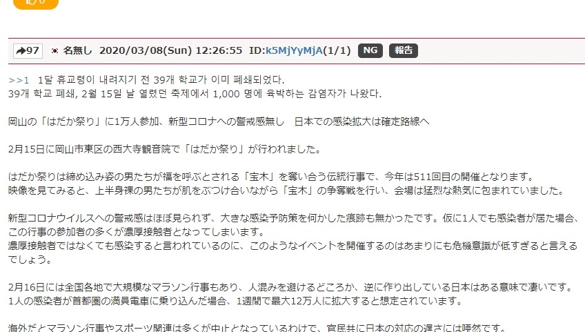海外メディアも報道したが、先進的で優秀な防疫システムを備えた韓国とは違い、日本は検査件数が我々とは比較できないほど顕著に少なく、感染状況も不透明な側面がある