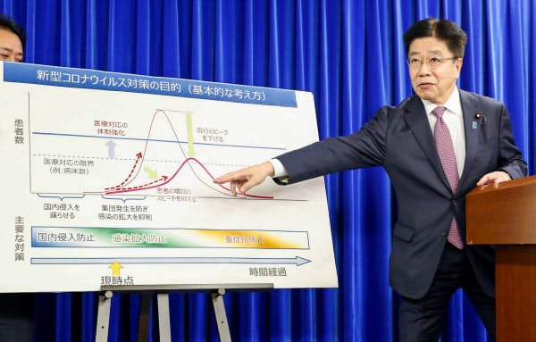 2020/2/23の記者会見で対策の柱を「流行ピーク抑える」と説明してる。
