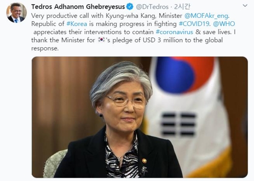 世界保健機関(WHO)のテドロス事務局長は8日、自身のツイッターに韓国の康京和(カン・ギョンファ)外交部長官と「非常に生産的な対話をした」として、「韓国はCOVID19(新型コロナウイルス)との闘いで進展を見せている」と書き込んだ。>>8