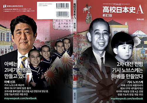 バンクは第二次世界大戦戦犯である岸信介と安倍晋三総理を前に出してポスター2枚を作った。土台の図は「高校日本史」新改訂版表紙の表と裏面だ。ポスターの表面には岸信介が外孫である安倍を抱き、「第二次大戦戦犯・岸信介が安倍を作った」というタイトルを、裏面には安倍晋三が岸信介を似た日本の小学生を抱いているポスターで、「安倍は21世紀の戦犯を作っている」というタイトルをそれぞれつけた。