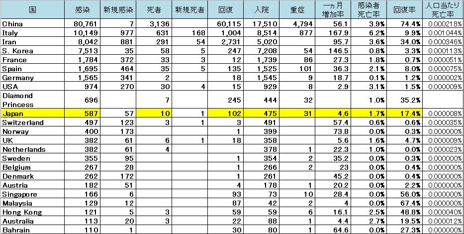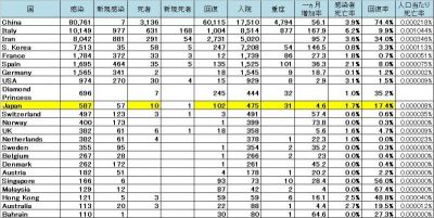 2捨韓2020/03/11(Wed) 07:50:23ID:I4OTI3NDg(1/1)NG報告https://www.worldometers.info/coronavirus/https://www.worldometers.info/world-population/population-by-country/感染者死亡率、人口当たり死亡率を計算してみた日本はうまくやってるんちゃう?10